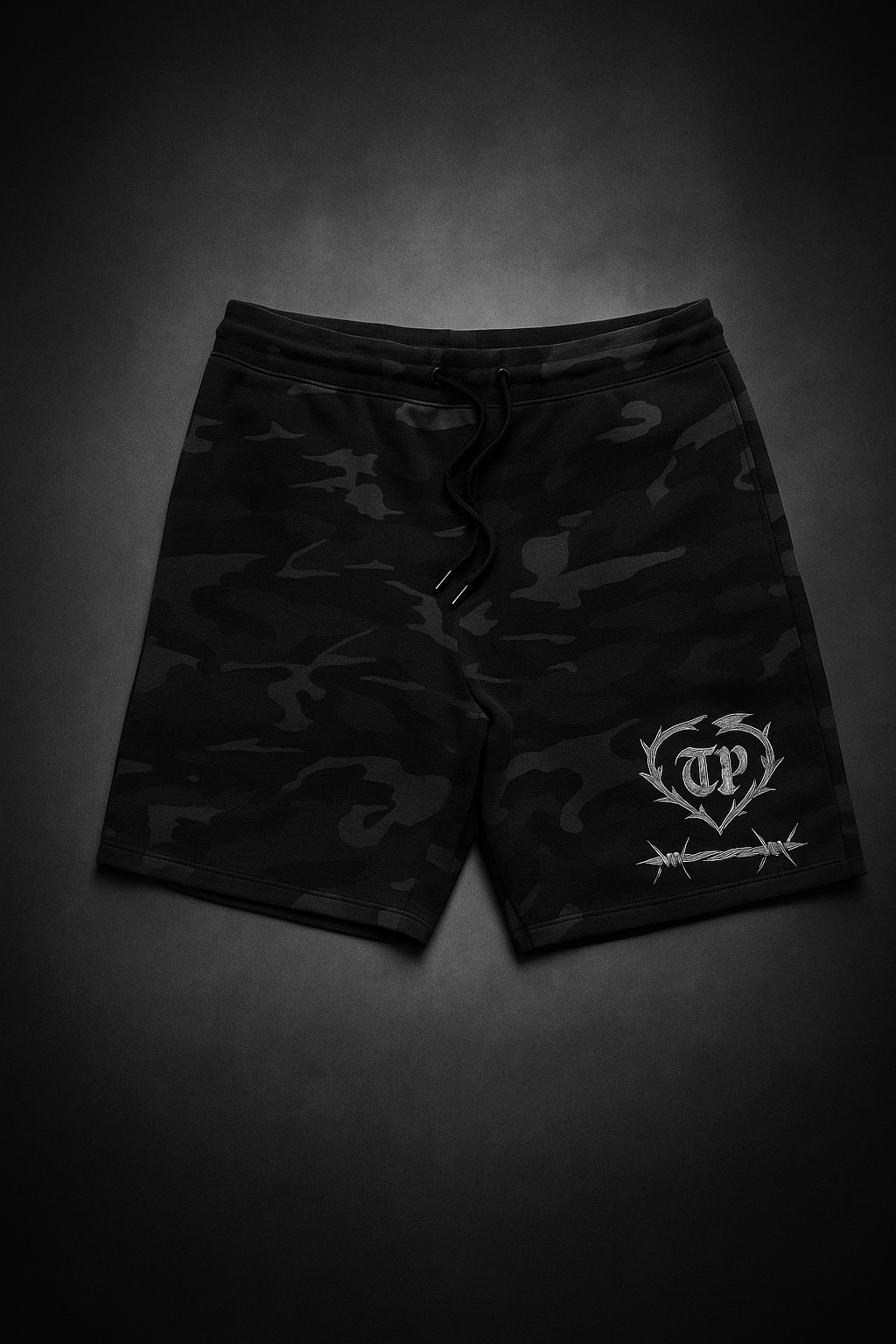 Forged from conflict and calm, the Thorn Heart Camo Shorts blend gothic aggression with everyday wearability.